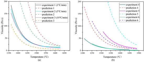 Figure 10 shows the indirect prediction of slag viscosity compared with the experimental results. Experiments 1, 2, and 3 shown in Figure 10a were the measurement results of the same sample at different cooling rates. The slag viscosity decreases significantly with the increase in cooling rate [27]. With the increase in cooling rate, mass transfer instead of subcooling becomes the main factor affecting the crystal growth rate [28]. However, the prediction results for experiments 1 and 2 were obviously larger, and the results for experiment 3 were small. The viscosity prediction results shown in Figure 10b still suffered from significant errors compared with the experimental values.