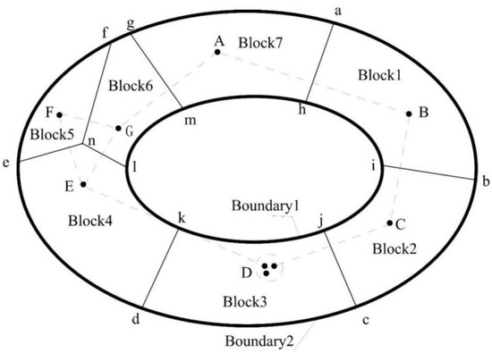 At the first step, several geological stations with very similar spaces are combined into a single station. For example, station D is the combination of three geological sampling points. In the second stage, the normal line is drawn by connecting two adjacent points of the geological station. As an example, the vertical bisection ah of AB intersects Boundaries 1 and 2 at points a and h, respectively, and the vertical bisection of BC intersects Boundaries 1 and 2 at points b and I, respectively. Or some vertical bisector nodes cross each other, like n. These nodes delineate the area adjacent to the corresponding geological station with the geological station as the center. For example, abih and lnfgm delineate the areas adjacent to stations B and G, respectively. Finally, Blocks 1, 2,… and 7 delineate the remaining geological units. These blocks are the adjacent blocks of geological stations. This geological unit is automatically assigned to the geological characteristics and mineral parameters of the contained geological sites, or the mean value of multiple geological sites. As shown in Figure 3.
