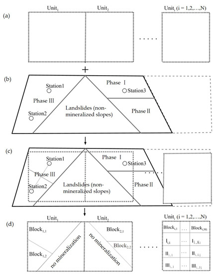The slope mineralized block segment of the segmented statistical unit: (a) statistical units Unit1, Unit2, and an arbitrary unit Uniti; (b) slope mineralization zones and geological survey stations; (c) superposition calculation of statistical units, mineralization zones, geological stations, and other layers; (d) Mineralized block segments of statistical units.