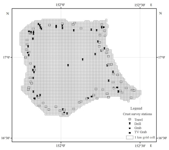 The working area of seabed solid mineral resource evaluation, including the survey area, exploration area, and resource area, collectively covers a large area, which is usually referred to as the seabed evaluation area. Smaller areas such as a seamount cover thousands of square kilometers [24], while larger areas such as the Pacific CC area of polymetallic nodules cover millions of square kilometers. The seabed evaluation area is equivalent to at least a dozen land geological maps at a scale of 1:100,000. The first process in large-scale (1:10,000, 1:50,000, 1:100,000) mineral resources evaluation maps is to divide statistical units. This process is especially important in seabed evaluation. The geostatistical unit division of cobalt-rich crust resources can be divided into the following three methods: