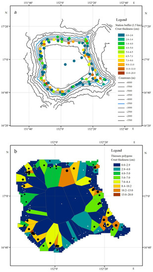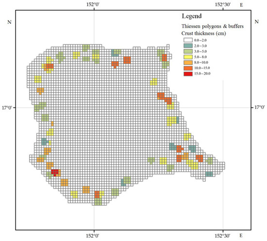 Information points of the Il’ichev seamount crust thickness are scarce. In order to make full use of geological sampling data, the crust thickness distribution parameters of the 1.5 km buffer were obtained according to the station shown in Figure 8a. Then the crust thickness parameters of the adjacent area were obtained using the Thiessen polygon shown in Figure 8b. The adjacent area controlled by the former station buffer is mainly used in the calculations, the boundary between adjacent stations delimited by the latter Thiessen polygon is supplemented, and the obtained value is assigned to the 1km grid unit. The assigned data are presented in Figure 9.