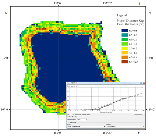 In order to realize the Kriging interpolation method of “slope–distance”, the topographic data were processed to make its range consistent with the coverage range of the divided geological unit (1 × 1 km). Then the slope method is applied to calculate the slope of each point in the 250 m precision topographic data. Finally, the average slope of 25 points in each geological unit grid is calculated to obtain the slope of the geological unit. The crust survey station and geostatistical unit were spatially superimposed and correlated, and the average slope of each station was calculated. The isobathic distance of the 3500 m boundary to the lower boundary was calculated using the Near method in ArcMap. The calculated “distance” and “slope” are used as the coordinate values of the “slope–distance” coordinate system of the station points, and the spatial layer “slope–distance.shp” is regenerated for all the station points in ArcMap. The station site statistical analysis method in the new layer was used to simulate the distribution function of the crust-thickness data using the Kriging method in Geostatistical Analyst. The QQ histogram in Figure 10 shows that, except for the mountaintop part, the crust thickness of other stations follows a normal distribution. Based on the simulation results and the experience of crusting investigation, spatial interpolation with a radius of 2 km was carried out and the obtained results are presented in Figure 10. Accordingly, Figure 11 illustrates the superimposed assigned values of statistical units that have no assigned values after step 4.2.