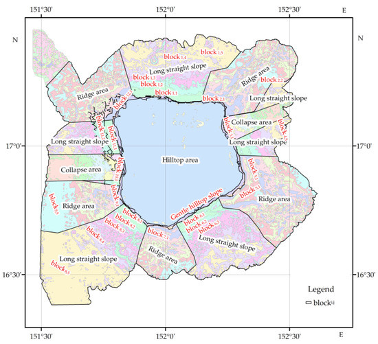 According to the results of the above two steps, the blocks divided from topography slope classification and landform classification are superimposed to create more detailed geological blocks: Blocki,j (i = 1, 2,…, N; j = 1, 2,…, n), as shown in Figure 14.