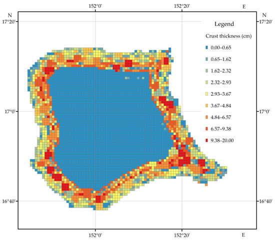 Figure 16 indicates that the crust thickness aggregates near the survey station. This may be attributed to the assignment method. As the topography of the seamount changes, it is characterized by a ring-shaped distribution, and the thickness distributions in the collapse area and the long straight slope areas with a large area, are obviously different from the other parts. The obtained results are consistent with experimental data [24] and previous investigations [10].