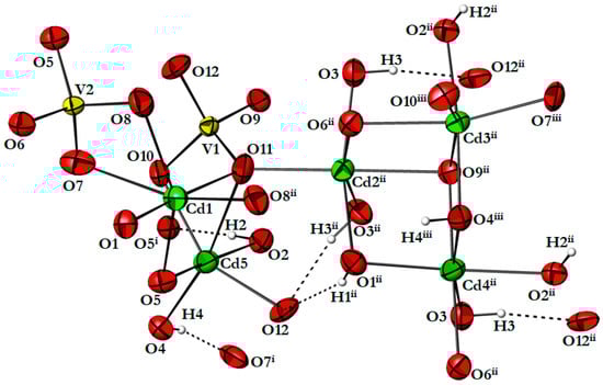 The asymmetric unit of Cd5(VO4)2(OH)4 exhibits two crystallographically unique vanadates(V) tetrahedra and five fully occupied Cd sites, each octahedrally coordinated [Cd1O5(OH), Cd2O3(OH)3, Cd3O4(OH)2, Cd4O2(OH)4, Cd5O4(OH)2] (Figure 1). The Cd1 site is coordinated by one OH group and five O atoms, with the <Cd1–OH,O> average distance of 2.351 Å, which is consistent with the bond length statistics and mean Cd–O distance of 2.302 Å []. The mean octahedral distances of <2.326>, <2.309>, <2.283>, and <2.359> Å for Cd2O3(OH)3, Cd3O4(OH)2, Cd4O2(OH)4 and Cd5O4(OH)2 octahedra, respectively, are also very close to 2.302 Å. They are also close to the value of 2.33 Å (0.95 + 1.38) calculated from the effective ionic radii for divalent cadmium octahedrally coordinated with the six nearest oxygen atoms [].
