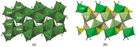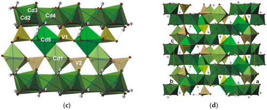 The V1O4 tetrahedra and Cd5O4(OH)2 octahedra share a common edge as well as the V2O4 tetrahedra and Cd1O5(OH) octahedra. Thus, they form two polyhedral pairs. Each pair VO4‒CdO5(OH) of coupled polyhedra is bonded to adjacent similar pairs sharing common vertices and forming [V1O4‒Cd5O4(OH)2]n and [V2O4‒Cd1O5(OH)]n chains in the [010] direction (Figure 2b). These two adjacent chains are further interconnected by edge-shared M(O,OH)6 (M = Cd1, Cd5) octahedra forming double chains of coupled polyhedra [V1O4-Cd5O4(OH)2-Cd1O5(OH)-V2O4]n and running along the same [010] direction.