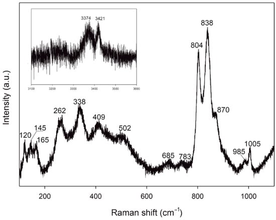 The Raman spectrum is shown in Figure 3. It reflects the complexity of the crystal structure. Bands in the high-energy range (3100–3600 cm–1) are due to the stretching of O–H bonds of hydroxyl groups. Bands in the 100–1100 cm–1 range are caused by internal vibrations either of VO4 tetrahedra or due to external vibrational modes.