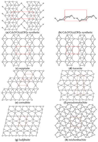 The nodal representation (nodes symbolize MO6 octahedra) of different topologies observed in M5(XO4)2(OH)4 compounds. The solid lines represent M···M interatomic distances shorter than 4 Å. A trace of the unit cell is drawn for reference (red). The projection (a) along the c-axis direction in synthetic Cd5(VO4)2(OH)4 (Cd1O6 octahedra are grey); (b) along the b-axis direction in synthetic Cd5(VO4)2(OH)4 (The similar metal wavy layers were found in arsenoclasite, Mn5(AsO4)2(OH)4, gatehouseite, Mn5(PO4)2(OH)4, as well as in synthetic Co5(PO4)2(OH)4); (c) along a-axis in reppiaite, Mn5(OH)4(VO4)2; (d) along [0 ] in turanite, Cu5(OH)4(VO4)2; (e) along [01 ] in cornubite, Cu5(AsO4)2(OH)4; (f) along a-axis in pseudomalachite, Cu5(PO4)2(OH)4 and cornwallite, Cu5(AsO4)2(OH)4; (g) along a-axis in ludjibaite, Cu5(PO4)2(OH)4; (h) along c-axis in reichenbachite, Cu5(PO4)2(OH)4.