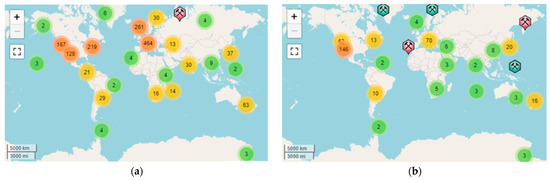 Worldwide map of localities for heulandite (a) [50] and clinoptilolite (b) [51] zeolite deposits. The numbers in circles correspond to the number of different deposits nearby, the color of the circles consistent with the number of deposits (from smaller to larger: green < yellow < orange). Compliments of Hudson Institute of Mineralogy dba Mindat.org.