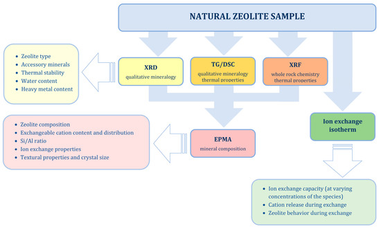 Depending on the geological settings and conditions at the time of mineral formation, natural zeolite deposits are usually a heterogeneous mixture of zeolite minerals, one or more, together with various amounts of gangue minerals. Clinoptilolite is associated with each of the other zeolites and with one or more of the following authigenic silicate minerals: clay minerals, potassium feldspar, opal, and quartz [37]. These parameters vary from one deposit to another; especially important are the differences in the cationic composition of zeolites from each deposit; sometimes they differ even for different strata of the same deposit. This makes it difficult to extend the methods of preparation of raw materials tested on minerals from a particular field to similar zeolites from other fields. Consequently, thorough mineralogical knowledge and detailed characterization of natural zeolites in any practical application is necessary when preparing a deposit for exploitation to unlock the full potential of natural zeolites. However, this is rarely conducted because detailed mineralogical analyses are complex and are often ignored in favor of simplified general chemical analyses. An overview of typical technical applications of natural zeolites, as well as a list of requirements for their use, is summarized in [52]. As an example, the authors chose to use the natural zeolite for ammonium exchange process and developed an analytical protocol to characterize their suitability in detail, consisting of a combination of a number of mineralogical and chemical methods.