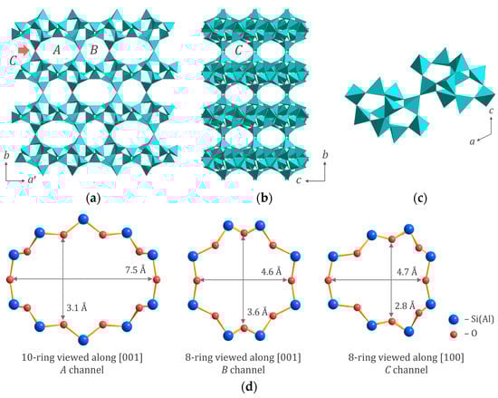 Schematic representation of different sections of HEU zeolite framework type viewed along [001] (a’ = a sinβ) (a), [100] (b) and [010] (c) directions; A, B, C channels (a,b) and two corner-sharing T10O20 units (c) as well as 10- and 8-membered rings (d) of the HEU structure are shown.