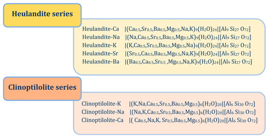 Clinoptilolite and heulandite form a continuous compositional series sometimes referred to as the heulandite group zeolites [59,60]. Zeolites having the same topologically distinct tetrahedral structure constitute a series when they exhibit a substantial range of composition in which the various extra-framework cations can be at the highest concentration among others in atomic proportions. These cations can occupy various positions. Such series consist of two or more species that differ in the dominant extra-framework cation.