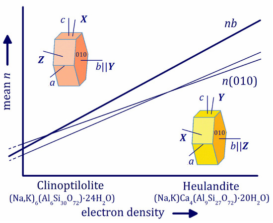 Assumed trends in optical properties from clinoptilolite to heulandite based on a synthesis of literature data are shown in Figure 5. The replacement of Ca2+ + Al3+ + H2O in heulandite by Na+ + Si4+ in clinoptilolite leads to a change in the optical properties of HEU zeolites. Bivalent cations and higher water content in heulandite channels lead to an increase in the average refractive index. The optical orientation changes from b||Y in clinoptilolite to b||Z in heulandite. The refractive index parallel to b increases at a higher rate than the refractive indices in the plane (010). This figure illustrates the ability of channel dwellers to affect the optical properties of heulandites and indicates that induced cation exchange in heulandite can change the optical properties of the mineral.
