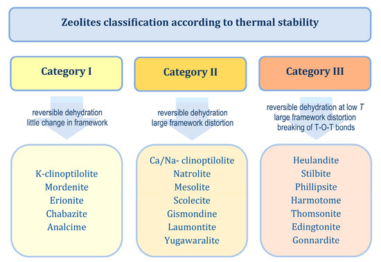 The paper [74] describes a convenient way to divide the volumetric and structural effects during heating of zeolites into three categories: (i) reversible dehydration accompanied, in some cases, by rearrangement of extra-framework cations and residual water molecules, with little or no change in framework and/or unit cell volume; (ii) complete or nearly complete reversible dehydration accompanied by large distortion of framework and significant reduction in unit cell volume; (iii) reversible dehydration at low temperature, usually accompanied by large changes in the framework, followed by irreversible changes due to the breaking of the T-O-T (tetrahedral cation-oxygen-tetrahedral cation, e.g., Al-O-Si) bonds to complete dehydration, see Figure 6. The same structural type of zeolite can occur in several categories depending on the nature of the tetrahedral framework, the charge on the framework, the order/non-order of Al-Si in the framework, and the number and type of extra-framework cations.