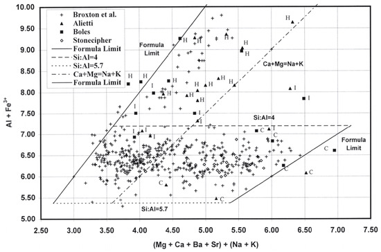 Figure 7 summarizes these trends for two minerals. It shows the assignment of samples (C = clinoptilolite; H = heulandite; I = intermediate) based on their thermal behavior, as well as the formula limits required by the charge balance. The horizontal lines Si/Al = 4 (conditional partition between clinoptilolite and heulandite), and Si/Al = 5.7 (limiting compositions found, compare with Table 1) are plotted. A line showing compositions, in which the amount of divalent and univalent extra-framework cations is the same, is also plotted. The compositions to the right of this line should have more univalent cations than divalent ones. Finally, lines of the “formula limit” are drawn, beyond which zeolite minerals with a given number of charged tetrahedra (Al3+ + Fe3+) in their framework cannot go, in order to set boundaries for the HEU compositions containing in the limiting case only divalent cations (left) or only univalent cations (right) [66].