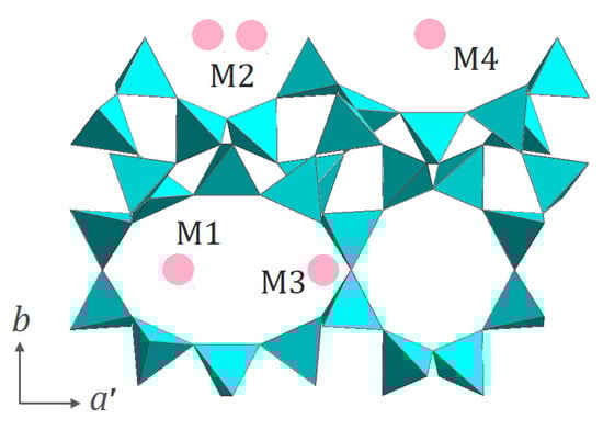 Cations sites M1, M2, M3 and M4 in A and B channels of clinoptilolite according to the Koyama and Takeuchi model [56] viewed along [001] (a’ = a sinβ).