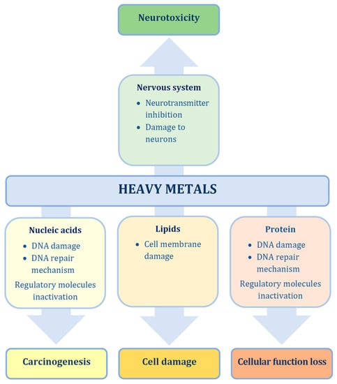 The pathways of heavy metal ions in the human body and their effects. Adapted with permission from Briffa, J. D et al., Heliyon; Elsevier Ltd. CC BY-NC-ND license (http://creativecommons.org/licenses/by-nc-nd/4.0/, 18 November 2022), 2020 [114].