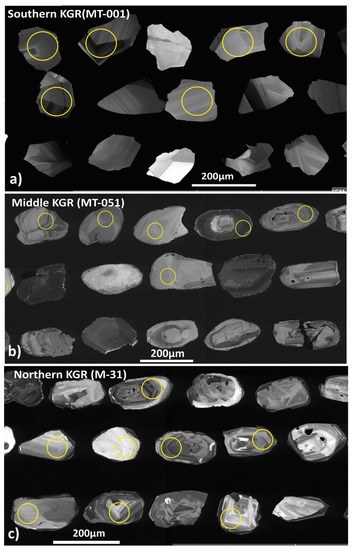 Representative CL image of three regions of the studied area (a) southern, (b) middle and (c) northern KGR. The circle represents the sot location.