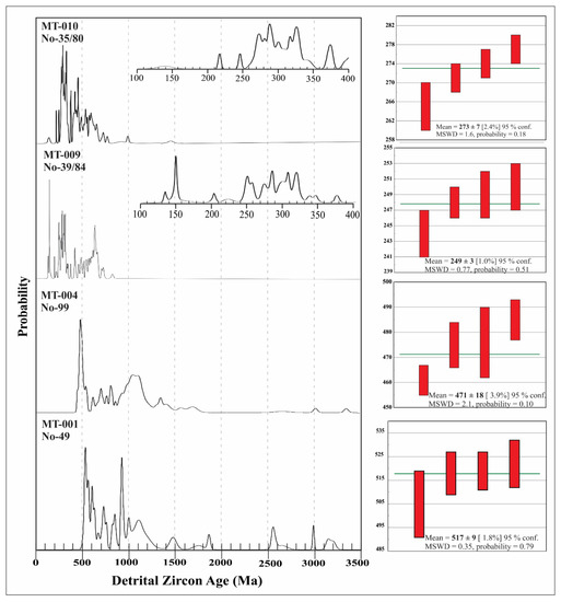 The zircons of the four samples from the Tigyaing area are mostly rounded to sub rounded and have shown oscillatory zoning (Figure 4a). The average Th/U ratio ranges from 0.05 to 2.85, in which dominant numbers of grains have higher value. Thus, the physical appearance and chemical composition indicate the zircons are of igneous origin [65]. Out of 350 analyzed zircon grains, 310 yielded acceptable ages. The U-Pb ages predominantly peak at 634 Ma, 525 Ma, 290 Ma and ~248 Ma, with a subordinate number of grains at 1075 Ma, 916 Ma, 592 Ma, 499 Ma and ~454 Ma. In addition, the ages of several of the grains were clustered at 3394–2717 Ma, and 2490 −1734 Ma, and ~1384–719 Ma (Figure 5). The youngest cluster of ages from all four samples: MT-001, MT-004, MT-010 and MT-009 are 518 ± 9 Ma, 471 ± 18 Ma, 273 ± 7 Ma and 248 ± 3 Ma, respectively (Figure 5).