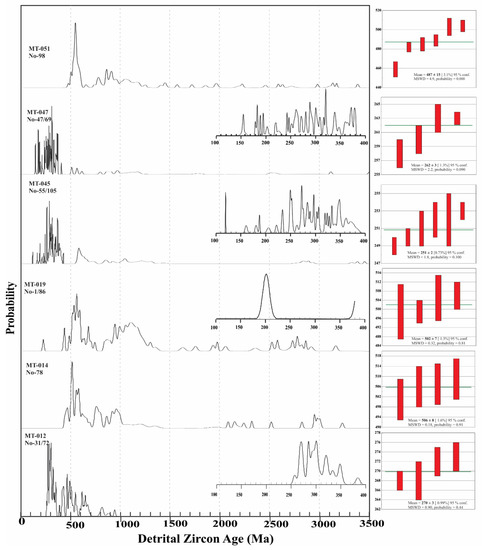 From the samples collected from the middle part of KGR, zircon crystals are mostly subangular to rounded (Figure 4b). This morphological characteristic indicates different magmatic zoning: in the inner zone, the pyramidal face is (101), evolving to (211) in the direction of the outer zone in the zircons’ zonation in CL images [66,67]. The Th/U ratio range from 0.01 to 2.63 in which the dominating numbers of grains have shown higher value indicating igneous origin [65]. Thus, the physical appearance and chemical composition indicate they are igneous in origin. Among 690 analyses, 509 yielded acceptable ages. The major age populations are in the ranges 1300–750 Ma, 700–450 Ma, and 400–100 Ma, with a small number being subordinate at 3400−2000 Ma (Figure 6). The youngest cluster of ages from the six samples MT-014, MT-019, MT-051, MT-012, MT-047, and MT-045 were 506 ± 8 Ma, 502 ± 7 Ma, 485 ± 7 Ma, 270 ± 3 Ma, 262 ± 3 Ma, and 251 ± 2 Ma, respectively (Figure 6).