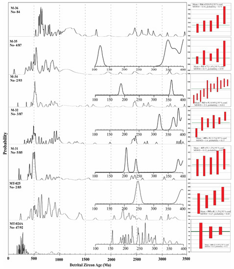 Normalized probability plot of detrital zircon U-Pb ages from this study, collected from the northern section of the Katha-Gangaw range. Samples include MT-024A, MT-025, MT-31, MT-32, and MT-34. Samples M-35 and M-36 are garnet–staurolite schists, whereas all other samples are quartzites. No = number of grain analyses in which the denominator indicates the total number and the numerator indicates the number of grains younger than 400 Ma. The right figure of each sample indicates the maximum depositional age.