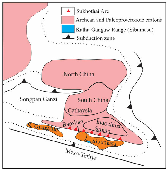 Simplified Late Triassic paleogeographic reconstruction (not to scale) including North China, South China, Indochina, South Qiangtang, and Sibumasu block containing rocks of the Katha-Gangaw Range: modified from [1,23].
