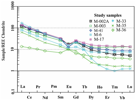 Chondrite-normalized plot of rare-earth element concentrations for rock samples after [99], collected from northern Myanmar. See Table 2 for complete geochemical results.