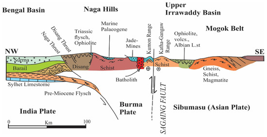 Northwest–southeast-oriented schematic cross section showing the northern Myanmar region during Mesozoic–Cenozoic time. The present-day suture boundary along the Sagaing fault zone along the western margin of the Katha-Gangaw range between western Myanmar and Sibumasu modified after Mitchell [36].