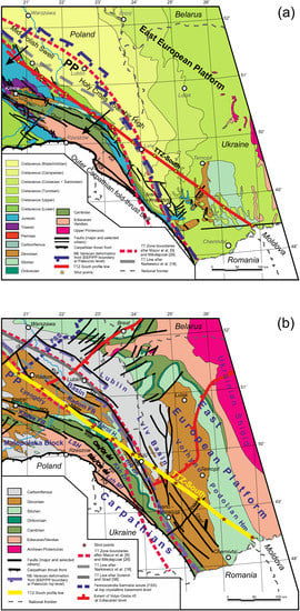 The sub-Permian deformed basement of the PP is cut by a network of faults, only the most important of which are shown on the map in Figure 3b. Their locations and courses (mostly inferred from drill hole data and/or industrial seismic reflection lines) are interpreted differently by particular authors. In general, the major WNW-ESE-directed faults tend to sub-parallel the TTZ-South profile over most of the Polish territory but change their strike slightly clockwise and assume an NW-SE trend on approaching the Ukrainian border, and, further on, tend to cross the profile, assuming an en-echelon attitude with respect to it. Some of the major faults are considered by, e.g., Narkiewicz (in [,,]) as subvertical discontinuities inherited from pre-Devonian wrenching, that continue directly from the crystalline basement into the Paleozoic succession at or near the southwestern edge of the EEP. Their regional persistence, continuity, subvertical attitude at depth and direct relationships with the deep basement are, however, currently questioned [,,,,] on the grounds of the recent seismic data and finding that some of them represent Variscan listric thrusts involved in thin-skinned tectonics reaching down to the Ediacaran/crystalline basement interface [,].