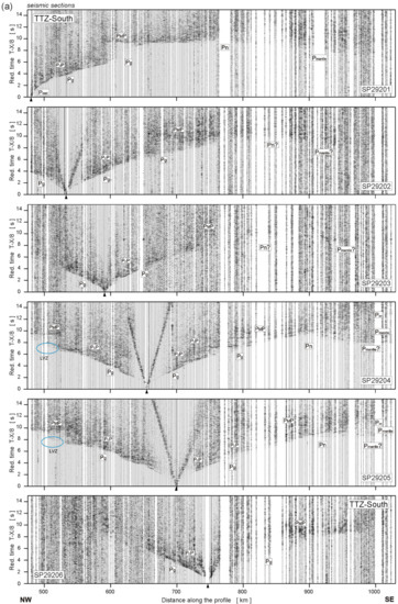 Examples of trace-normalized, vertical-component seismic record sections for (a) SP29201-SP29206 and (b) SP29207-SP29211. A band-pass filter (2–15 Hz) has been applied. Psed—P refractions from sedimentary layers; Pg—P refractions from the upper and middle crystalline crust; Pov—P overcritical crustal phases; PcP—P reflections from the mid-crustal discontinuities; PMP—P reflections from the Moho boundary; Pn—P refractions from the sub-Moho upper mantle; Pmantle—lower lithospheric P phases; LVZ—low-velocity zone. The reduction velocity is 8.0 km/s.