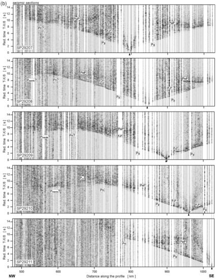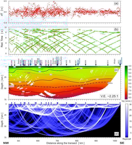 Tomographic inversion of the P-wave first arrivals of the TTZ-South, as well as the SE part of the CEL03 profiles, was conducted using the back-projection method proposed by Hole []. A model area measuring 1026 × 72 km (length × depth) was chosen. The 1D velocity-depth model that was utilized as the initial model for the 2D inversion was calculated using the Wiechert–Herglotz inversion method. The input for the Wiechert–Herglotz method was an average travel-time curve obtained by fitting a polynomial to all first-arrival picks. The first inversion steps were carried out for picks up to 60 km offset and in subsequent iterations, picks for up to maximum offsets of 120 km, 180 km, 360 km, and 690 km, respectively, were used, which corresponded to an increasing penetration depth of the seismic rays in the model. In total, 4196 P-wave first arrivals were used in the inversion process. In each iteration, smoothing filters were applied to the velocity corrections, which were then added to the previous velocity model. The size of the smoothing filter was gradually decreased with the number of the iteration, in order to start with a smooth solution and, in subsequent steps, to gradually increase the resolution of the model. The spacing of the model grid, which was 1 × 1 km, is definitely smaller than the obtainable resolution of the model itself. For the calculation of the final model, 45 iterations in total were used. The root mean square (RMS) travel-time residual for the final model was 140 ms.