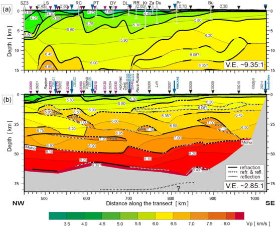 As the extent of the CELEBRATION 2000 experiment in this region was limited by the Polish-Ukrainian border, no information was acquired about the structure of the southern, Ukrainian part of the Teisseyre–Tornquist zone, or, more generally, of the TESZ. A number of Deep Seismic Sounding (DSS) profiles were made in west Ukraine previously. Early Soviet DSS profiles—Geotraverses II, IV, and VI (Figure 1)—were acquired in the 1970s–1980s []. All the previous investigations were focused mainly on the recording of reflected seismic phases and provided only limited velocity information. Two modern DSS profiles that cross the southeastern part of the TTZ were PANCAKE, performed in 2008 [], and RomUkrSeis in 2014 [].