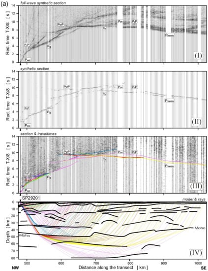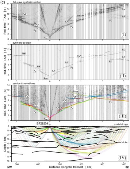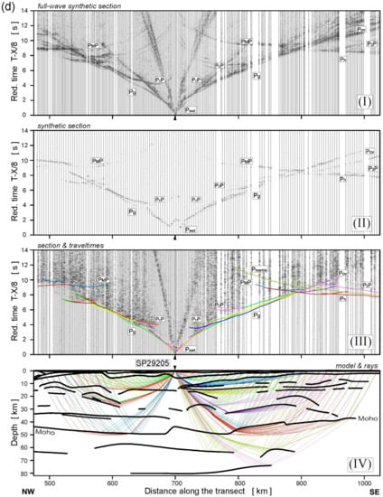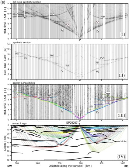 Examples of seismic modelling along the TTZ-South profile, for the model presented in Figure 7: (a) SP29201, (b) SP29202, (c) SP29204, (d) SP29205, (e) SP29207, (f) SP29208 and (g) SP29210. Diagrams: (I) Full-wave synthetic seismograms derived from the SEIS83 velocity model using TESSERAL package []; (II) Synthetic seismograms derived by using the SEIS83 package; (III) Seismic record section (trace-normalized, vertical-component, 2–15 Hz band-pass filtered, reduction velocity of 8.0 km/s) of P-waves with theoretical travel-times calculated using SEIS83 []; (IV) Selected rays from SEIS83 defining the prominent model interfaces. Abbreviations of seismic phases as in Figure 5 and P1P, P2P—lower lithospheric P-wave reflections.
