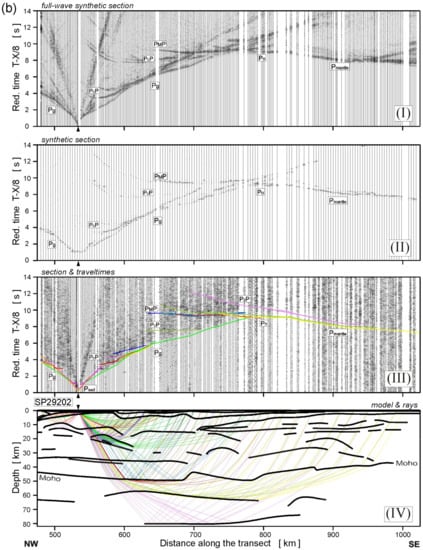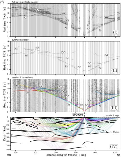 Full waveform synthetic sections were calculated using the Tesseral package []. The code is based on a fast and accurate finite–difference computational scheme. It allows for efficient calculation of the wavefield in an arbitrarily complex elastic medium. In the present study, as with the models of the GEORIFT 2013 [] and RomUkrSeis profiles, the final ray-tracing velocity model (Figure 7) was transformed into the input model in the Tesseral format, which consists of a sequence of layers defined by layer-like polygons. Thus, individual layers of the final ray-tracing model were converted to polygons with the same P- and S-wave velocities as in the final ray-tracing model. Subsequently, the polygons were edited and smoothed. The surface topography was also taken into account. Several source wavelets were tested, and finally, the [] wavelet with 10 Hz frequency was chosen. It allowed performing the calculations for such a large model in a reasonable time, given the available computational resources, and avoided spatial aliasing and numerical instability. Due to the large volume of input data, the computations were parallelized using a grid of computers []. Comparison of the full waveform synthetic sections with the observed seismic record sections, as well as the ray diagrams, are presented in Figure 8, respectively. We observed a good agreement between synthetic sections and observed data, which also confirms that the velocity model has a satisfactory accuracy, as discussed further in the article.