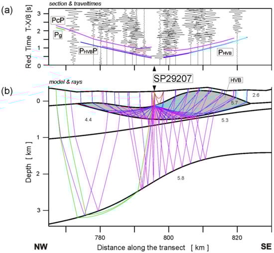 Example of seismic modelling of the high-velocity body (HVB) in the upper crust near SP29207, along the TTZ-South profile. (a) Seismic record section of P-waves with theoretical travel-times for the corresponding model (Figure 7) calculated using the SEIS83 ray-tracing package []. The seismograms show the trace-normalized, vertical-component of ground motion band-pass filtered from 2–15 Hz. Reduction velocity is 8.0 km/s. (b) Ray diagram of selected rays using the SEIS83 package. Abbreviations of seismic phases as in Figure 5 and PHVB and PHVBP—refraction through and reflection from the base of the high-velocity body, respectively.
