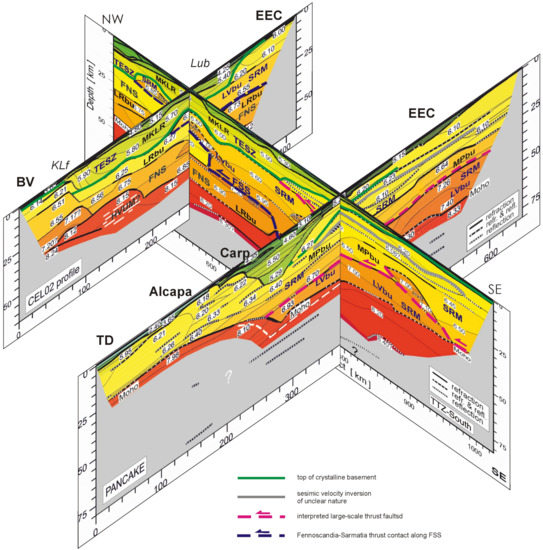 - Guterch, A.; Grad, M.; Keller, G.R.; Brückl, E. Crustal and Lithospheric Structures Between the Alps and East European Craton from Long-Range Controlled Source Seismic Experiments. In Treatise on Geophysics, 2nd ed.; Schubert, G., Romanowicz, B., Dziewonski, A., Eds.; Deep Earth Seismology; Elsevier: Amsterdam, The Netherlands; Oxford, UK, 2015; Volume 1, pp. 557–586. [Google Scholar] [CrossRef]
