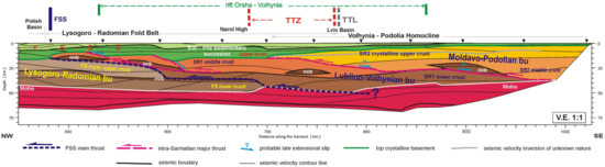 Geological cross-section along the TTZ-South seismic profile. The section is much simplified, with no faults shown, 5 times vertically exaggerated and partly hypothetical, combining drillhole results for shallow levels with reflection seismic data of the PolandSPANTM project (as presented by Mikołajczak et al. [] and Mikołajczak []) and wide-angle reflection/refraction seismic models from this and previous papers for deeper levels, and data from other sources (e.g., [,]). Faults are completely omitted as they mostly cannot be unambiguously interpreted from the available data, particularly when the profile stretches along or at a very low angle to the trend of the major structures. Along-strike projections of the range of several predicted locations for the Fennoscandia—Sarmatia suture (FSS, after [,,], taking into account data from [,] and of the Orsha—Volhynia rift basin system (after [,]) from the East European craton are also shown.