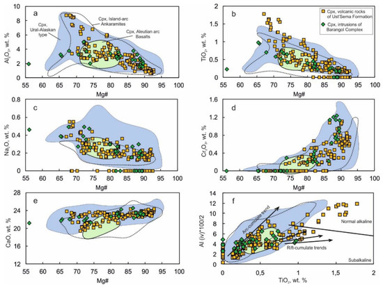 Variations in the composition of clinopyroxene from the rocks of the Ust’-Sema Formation and the Barangol Complex compared with clinopyroxene from island arc ankaramites [33,34,35,36], Ural–Alaskan-type intrusions [39,41,42], and basalts of the Aleutian arc [44,45]. (a) Mg# vs. Al2O3; (b) Mg# vs. TiO2; (c) Mg# vs. Na2O; (d) Mg# vs. Cr2O3; (e) Mg# vs. CaO (f) TiO2 vs. Aliv*100/2. The boundaries of the fields from [46] and the trends from [47].