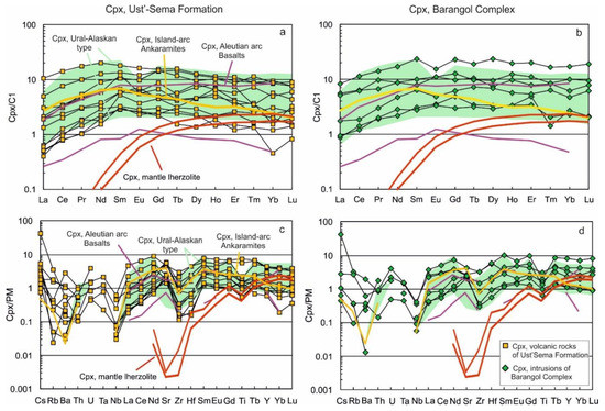(a,b) Chondrite-normalized spectrum distribution of the rare-earth elements [26] and (c,d) primitive mantle-normalized spider diagrams [32] for the clinopyroxenes from the Ust’-Sema Formation and the Barangol Complex rocks compared with clinopyroxene compositions from island arc ankaramites [33] and mantle lherzolite of the Kamchatsky Mys [31] are shown. Continued line: core of crystal; dashed line: rim of crystal with clinopyroxene from island arc ankaramites [33], Ural–Alaskan-type intrusions [42], and basalts of the Aleutian arc [48].