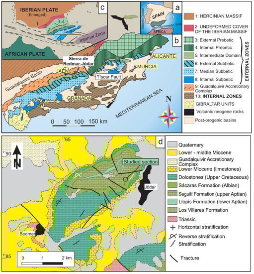 Geological setting of the Sierra de Bedmar-Jódar. (a) Location of the Betic Cordillera in the South of Spain. (b) Geological sketch of the Betics with position of the Sierra de Bedmar-Jódar, to the West of the Tíscar Fault. (c) Paleogeographic reconstruction of the South Iberian Margin for the Early Cretaceous. (d) Geological maps of the Sierra de Bedmar-Jódar with the location of the studied section.