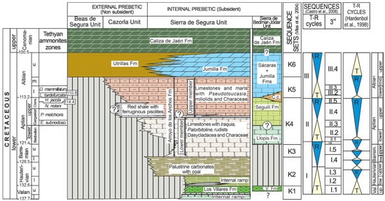 Chronostratigraphic chart of the Prebetic in the Cazorla-Segura outcrops and correlation with the Sierra de Bedmar-Jódar. The numerical ages (in Ma) and the Tethyan Ammonite Zones are from [25]. The sequence sets are from [14]. The chronostratigraphic record of these units is correlated with the sequences (T-R cycles and sequences of 3rd order) from [5] and the cycles of [26]. T-R: transgressive-regressive. C.c.: Continental carbonates. Fm: Formation. Fms: Formations. L.V. Fm: Los Villares Formation. Val.: Valanginian. up.: upper. low.: lower. mid.: middle.