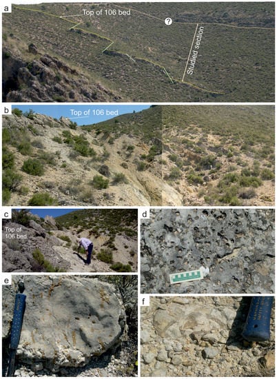 Features of the outcrops. (a,b) Panoramic view of the outcrop. The top of the 106 bed is remarked with the position of some paleofaults in (a,c). Irregular morphology of the top of the 106 bed. (d). Borings in the top of 106 bed. (e) Rizholiths (in brown color) in a limestone bed. (f) Rudists in nodular limestones.