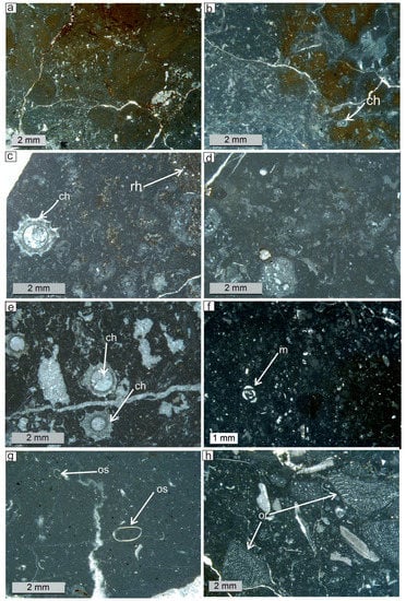 Microfacies recognized (according to the Table 1). (a) Microfacies 1: Azoic mudstone with desiccation cracks and mottled texture (RO-C-495). (b) Microfacies 2: Mudstone with charophytes (RO-C-485). (c) Microfacies 2: Mudstone with charophytes (RO-C-490) and rhizoliths. (d) Microfacies 3: Wackestone with charophytes (RO-C-476). (e) Microfacies 4: Packstone with charophytes (RO-C-480). (f) Microfacies 5: Mudstone with miliolids (RO-C-492). (g) Microfacies 6: Mudstone with ostracods (RO-C-482). (h) Microfacies 7: Wackestone with orbitolinids (RO-C-498). For all the images: ch: charophyte; rh: rhizolith; m: miliolid; os: ostracod; or: orbitolinid.