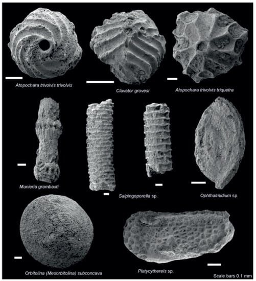 The presence of Atopochara trivolvis var. trivolvis and Clavator grovesii var. lusitanicus indicates that the waters could have a wide range of salinity, from fresh to brine waters, which is corroborated by the presence of miliolids and Salpingoporella sp. These charophytes are common in coastal ponds enriched in organic matter from the Escucha Formation (Iberian Chain) and in the Montsec (Central Pyrenees) [29,30]. These environments occurred during a relative sea-level lowstand stage, with development of pedogenic processes that affected the emerged coastal marine sediments [42].