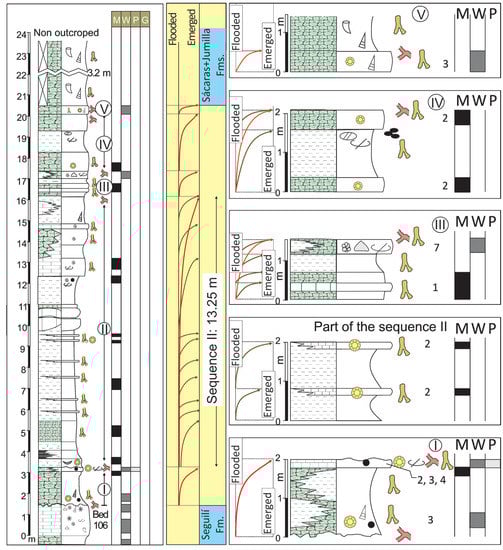 Above the irregular surface, controlled by paleofaults, with desiccation cracks developed in subaerial conditions, at the top of bed 106 (Figure 3, Figure 4a–c and Figure 7), five shallowing upward elementary sequences (I to V in Figure 7) can be recognized, whose tops are also characterized by desiccation cracks. The thickness of each sequence ranges between 0.5 m (sequence V) and 13.25 m (sequence II).