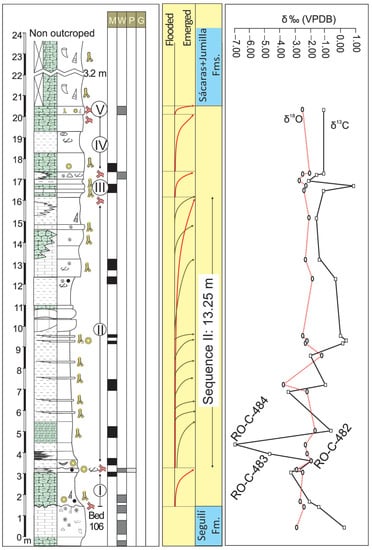 While the δ18O values are around the published Aptian and Albian marine values (δ18O = −2‰; [31]), the δ13C shows negative values, far from the marine value for this ratio proposed by the same author for that time interval (δ13C = 2‰, [31]). The lower and higher values of δ13C are −6.81‰ and 0.87‰ respectively (standard deviation 1.65‰), with an average value of −1.67‰. The δ18O values range between −3.85‰ and −1.29‰ (Table 2) and their average value is −2.39‰ (standard deviation 0.47‰). The strong negative δ13C shifts detected from the sample RO-C-483 and 484 (both samples are black marls), whose values are −4.57 and −6.81 respectively (Table 2 and Figure 8) must be emphasized.