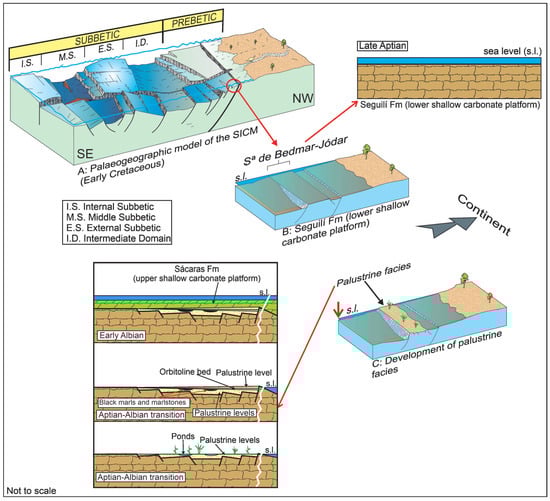 At a global scale, the Aptian–Albian transition has been characterized by important paleogeographic changes related to the Central Atlantic rifting stage [7] and with climatic changes marked by short duration episodes where warm and cold climates alternate [2,11,35,36,37]. In the SICM, a shallow platform on a fault block tilted to the NE was developed which at present crops out in the Sierra de Bedmar-Jódar, which is similar to that described by other authors on the southern margin of the Alpine Tethys with a clear evidence of extensional tectonics [7,37,38,39,40]. The Sierra de Bedmar-Jódar belongs to the so-called Prebetic of Jaén, made by isolated outcrops without apparent connection to the rest of the Prebetic platform [6,19,20,21,22,23,24]. Tectonics was an important factor controlling the sedimentation, as can be evidenced by the small faults affecting the bed number 106 (Figure 4a) of the studied succession. A small-scale graben was developed and, simultaneously, a relative sea level fall occurred. Consequently, continental environments were established on the emerged areas with development of palustrine facies. However, these continental environments were probably sensitive to relative sea level changes and to the fluctuations on the piezometric level. Locally, some ponds were developed, where organic matter accumulation occurred with the formation of black marls and marly limestones (Figure 10).