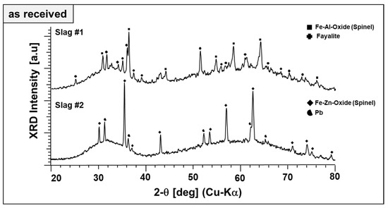 Two different metallurgical fayalite slags were used in this study. Slag 1 is a by-product generated in a copper recycling shaft furnace and is commonly used as an aggregate for building applications [17]. Slag 2 is a by-product of the lead industry, and it was produced in a Queneau–Schuhmann–Lurgi reactor (QSL reactor). In this reactor, lead concentrates containing lead sulfides and end-of-life material are smelted in an oxidation zone to remove sulfur and in a subsequent reduction zone, carbon carriers are injected to reduce lead oxides to recover lead [18]. The slags were water granulated after the pyrometallurgical treatments and ground before the investigation in a planetary mono mill (Pulverisette 6, Fritsch, Germany) and sieved with a 50 µm mesh.