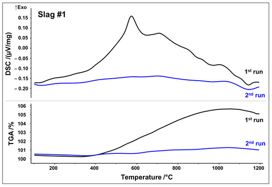 Simultaneous thermal analyses (STA) were used to monitor the thermal evolution of slags in the temperature range of 25–1200 °C in a simulated air atmosphere (80 vol% N2, 20 vol% O2). To capture irreversible and reversible thermal events, two subsequent runs were performed. DSC as well as thermogravimetric analysis (TGA) curves from the first and second STA runs are plotted in Figure 3 and Figure 4, respectively.