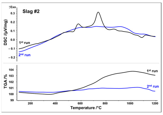 Slag 2 exhibits similar exothermic reactions with two well-defined peaks, at 580 and 740 °C. TGA analysis also reveals a substantial mass increase of around 3.8 wt.% between 400 and 1000 °C, but to a lesser extent than that observed in slag 1 (Figure 4) (equivalent to 1.19 mol O2 absorption per 1 kg slag). Again, it can be seen that mass increase and exothermic reactions due to the oxidation/crystallization do not take place upon second heating, implying the complete oxidation and crystallization of thermodynamically stable phases upon first heating except for a weak endothermic peak observed at 1090 °C, again indicating partial melting. It is noteworthy that both slags reach their mass gain maxima at about 1030 °C in both runs, followed by a minor mass loss up to 1200 °C. Assuming oxidation, i.e., uptake of O2, as a source of mass gain, reduction, i.e., release of O2, is a plausible source of the minor mass loss beyond 1030 °C.